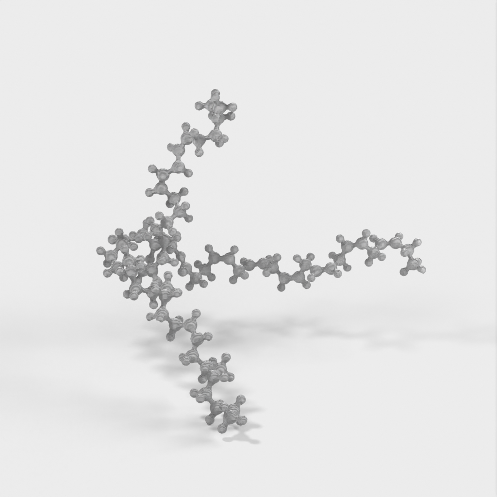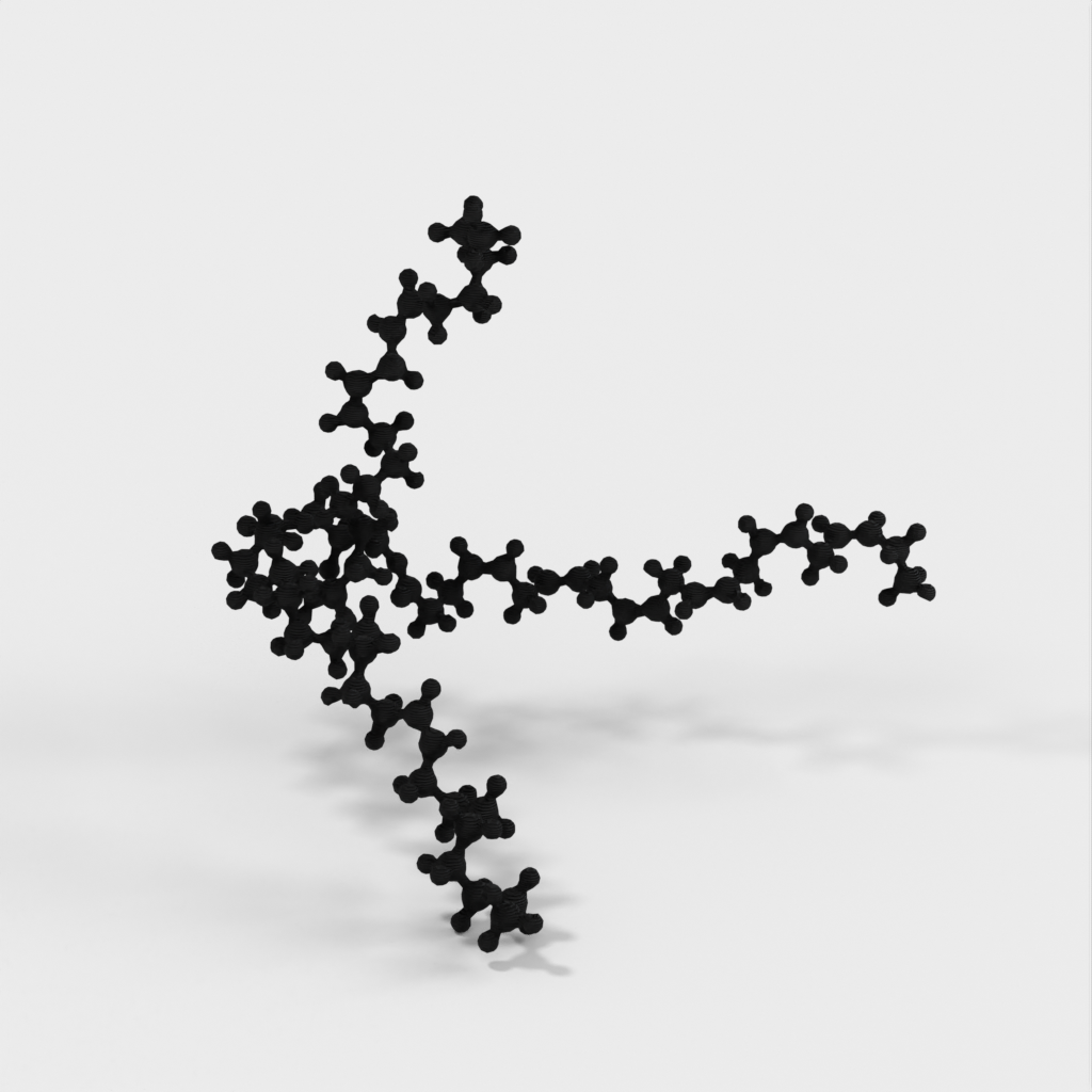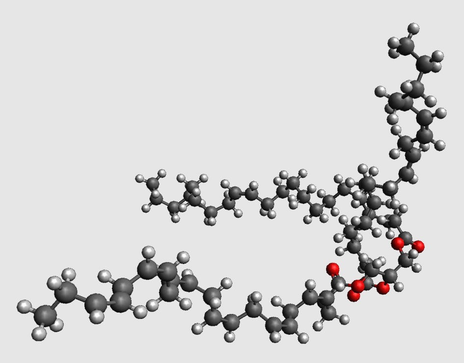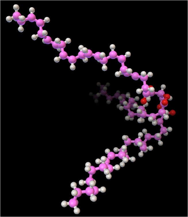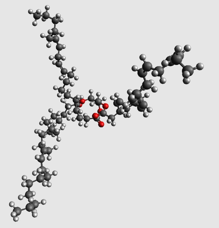 Molekulární model triaclglycerolu v atomárním měřítku, který lze použít ve 3D. Použijte tento model k výuce dětí o chemii, zejména v souvislosti s různými aspekty stravování a stavebními kameny a energií v těle (tento model představuje jednoduchý tuk).