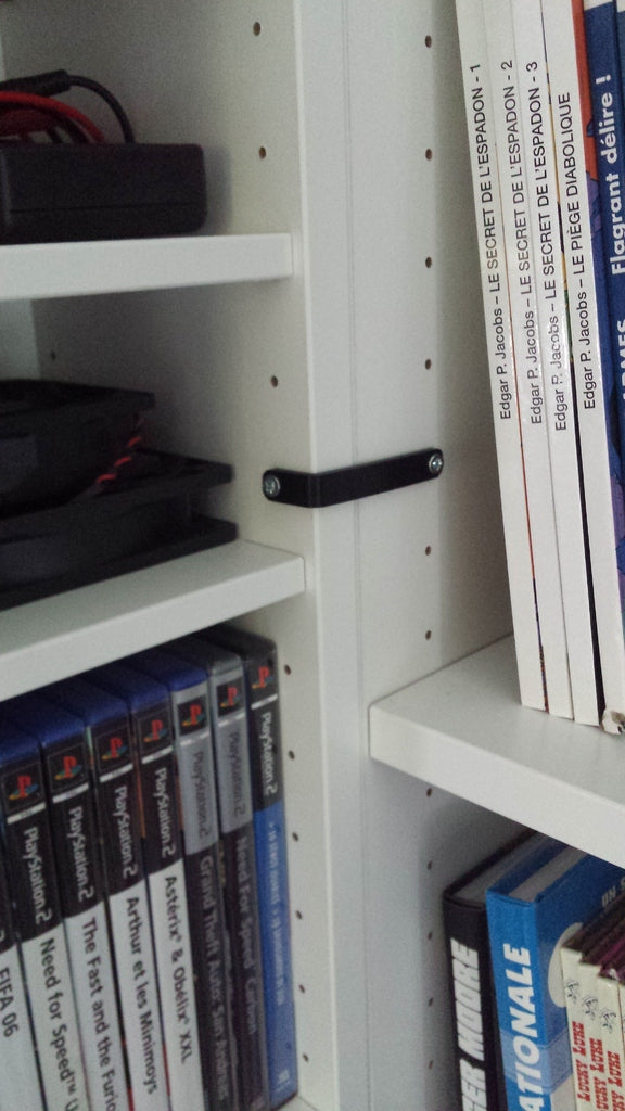 Tento držák je navržen tak, aby pojal dvě poličky IKEA BILLY ( http://www.ikea.com/fr/fr/catalog/products/30323353/ ) a jednu polici IKEA GNEDBY ( http://www.ikea.com/fr / fr/catalog/products/00323364/ ) na úhlu. Toto řešení pomáhá vyhnout se flexibilitě a mezerám mezi policemi a vyžaduje pouze originální montáž pro police a 2 malé šrouby pro instalaci držáku.