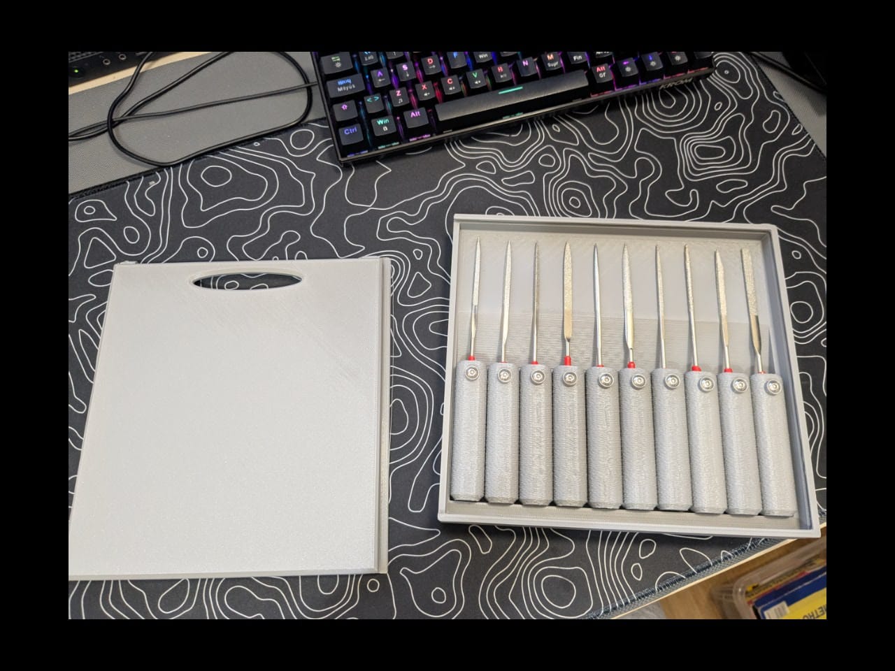 Úložný box je dodáván s ochranným víkem o rozměrech přibližně 195 mm × 209 mm × 13 mm, které zajišťuje, že obsah zůstane chráněn před prachem a poškozením a že rukojeti zůstanou na svém místě. Malé krytky šroubů o rozměrech přibližně 9 mm × 9 mm × 4 mm přispívají k úhlednému provedení a větší stabilitě.