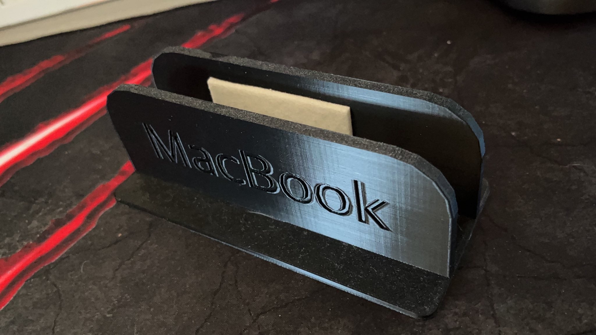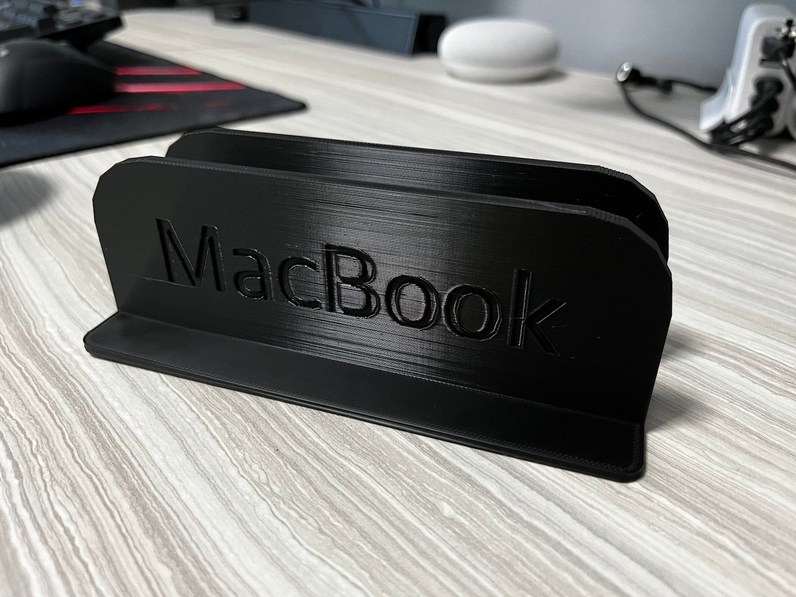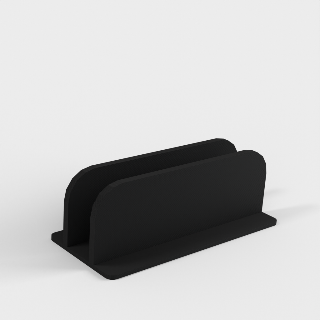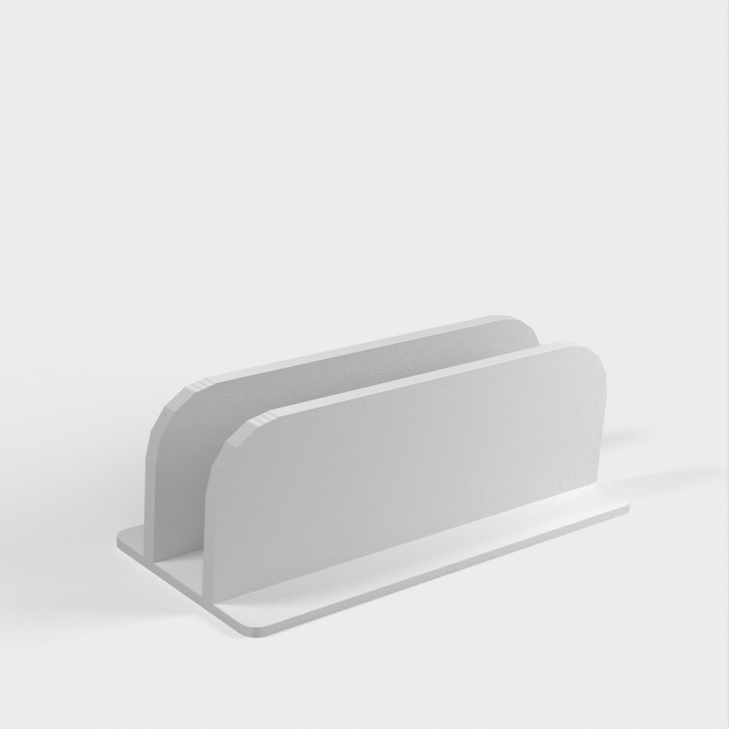 Jedná se o vertikální stojan pro MacBook Pro 14'. Stojan udrží MacBook na místě, takže jej můžete umístit na stůl, aniž by zabíral mnoho místa. Dovnitř stojanu jsem nalepil plstěné podložky, které zajišťují dokonalé přizpůsobení a zabraňují poškrábání MacBooku. Vezměte prosím na vědomí, že stojan je o něco širší než váš MacBook.