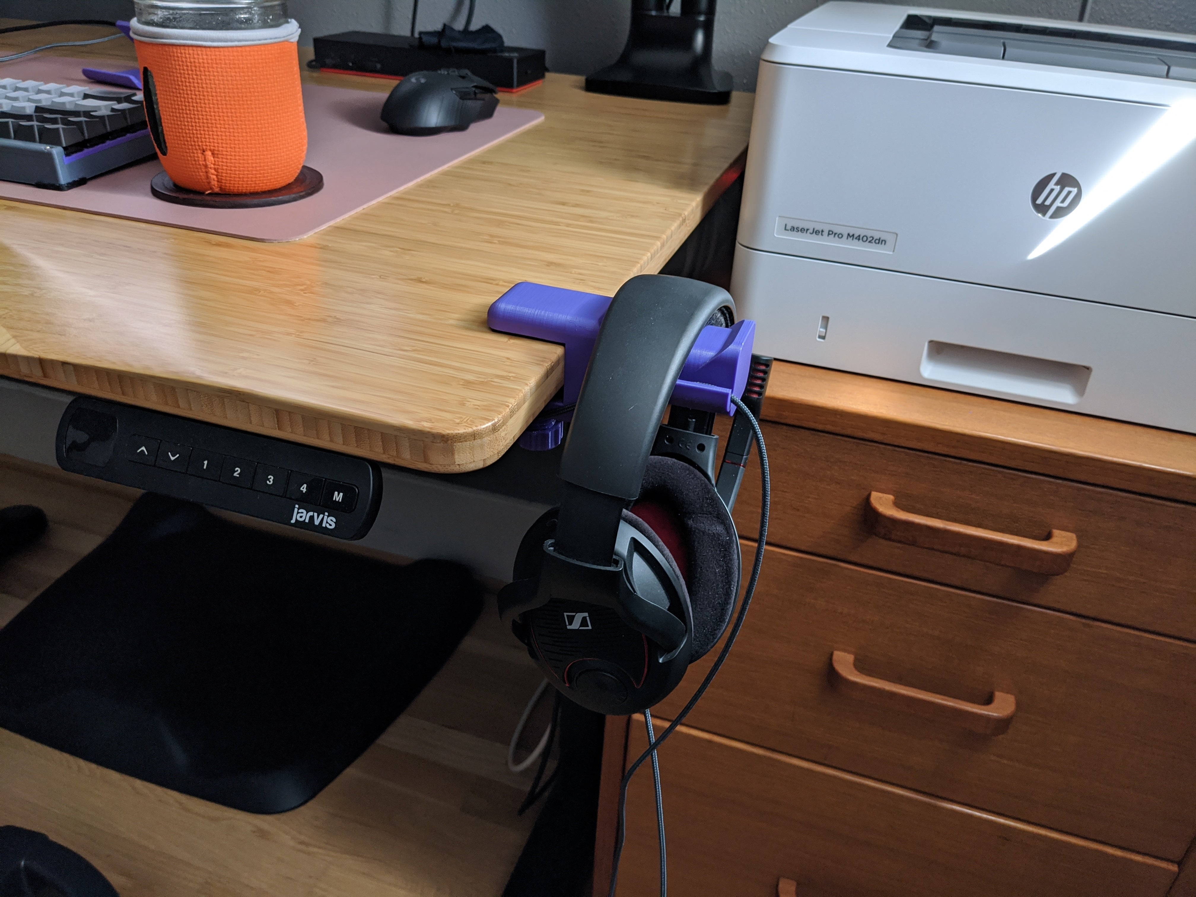 Jedná se o věšák na sluchátka, který lze připevnit na stůl. Lze jej parametricky přizpůsobit prostřednictvím aplikace Fusion 360 tak, aby vyhovoval vašim potřebám. Po vytištění je nejlepší na plochy, které se dotýkají stolu, připevnit něco s nějakými úchyty. Tím zajistíte, že věšák zůstane pevně připevněn ke stolu a nebude klouzat.
