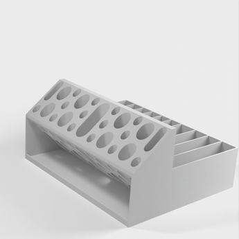 Tento držák na kleště Remix je navržen pro snadnější uspořádání vaší sbírky nářadí. Má větší oválné otvory, do kterých se vejde půlkruhový klíč, a širší otvory pro silnější rukojeti kleští. Ve spodní části části s kulatými otvory je přidán okraj, který zabraňuje vyklouznutí/proklouznutí menších předmětů. Ideální pro 3D tiskárny, hobbyisty, organizaci pracovního stolu a skladování v dílně.