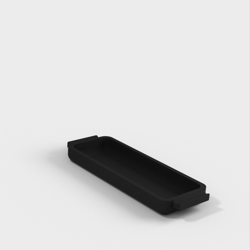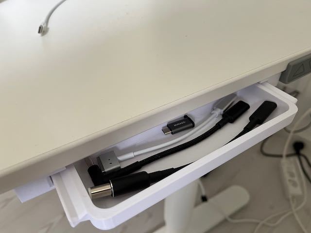 Zásuvka s jezdci na výškově stavitelný psací stůl "Bekant" z IKEA. Tato zásuvka je výškově nižší a délka je přizpůsobena psacímu stolu "Bekant". Ideální pro mé USB-C kabely a adaptéry.
